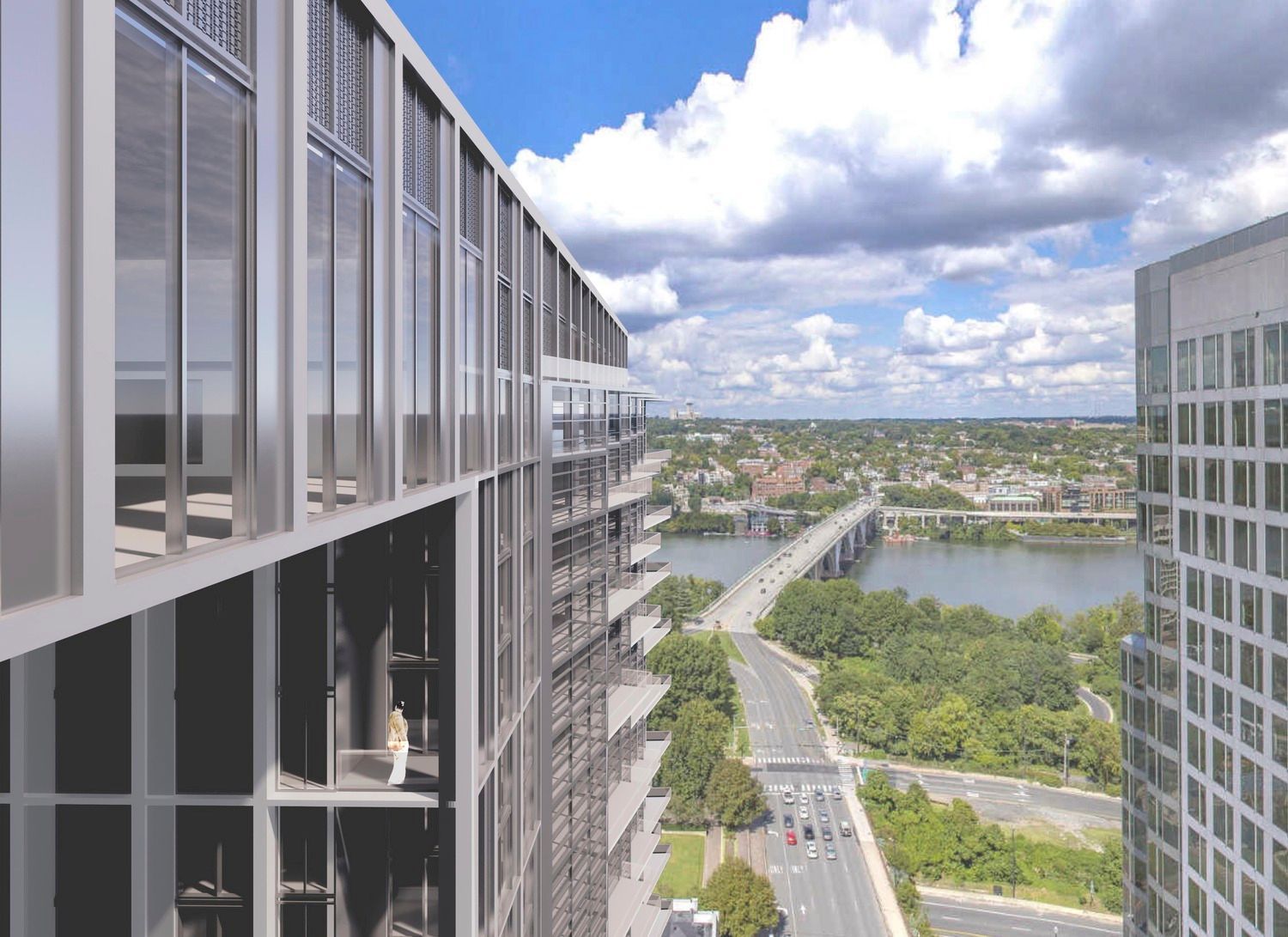 A striking glass skybridge interconnects the towers and features a clubroom equipped with a full kitchen, private dining area, fireplace, and a gaming zone, all complemented by breathtaking vistas. The rooftop amenities include a resort-style pool, an entertainment deck, and a 360-degree observation platform delivering panoramic views of Washington, DC, the National Cathedral, and the Potomac River. The two-story fitness center is equipped with an outdoor workout terrace.